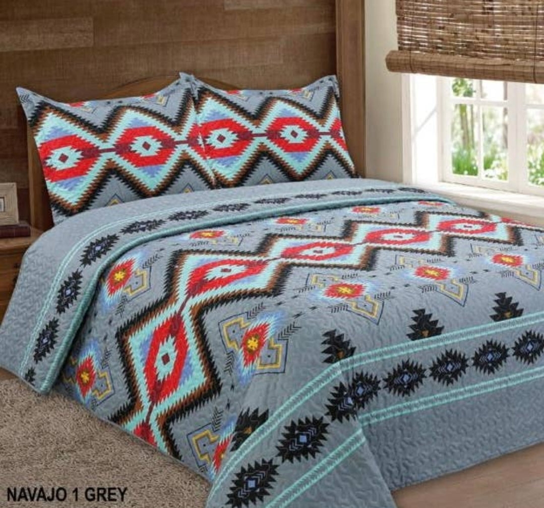 Grey Navajo 3pc Bedspread quilt Set - King/Cal-King